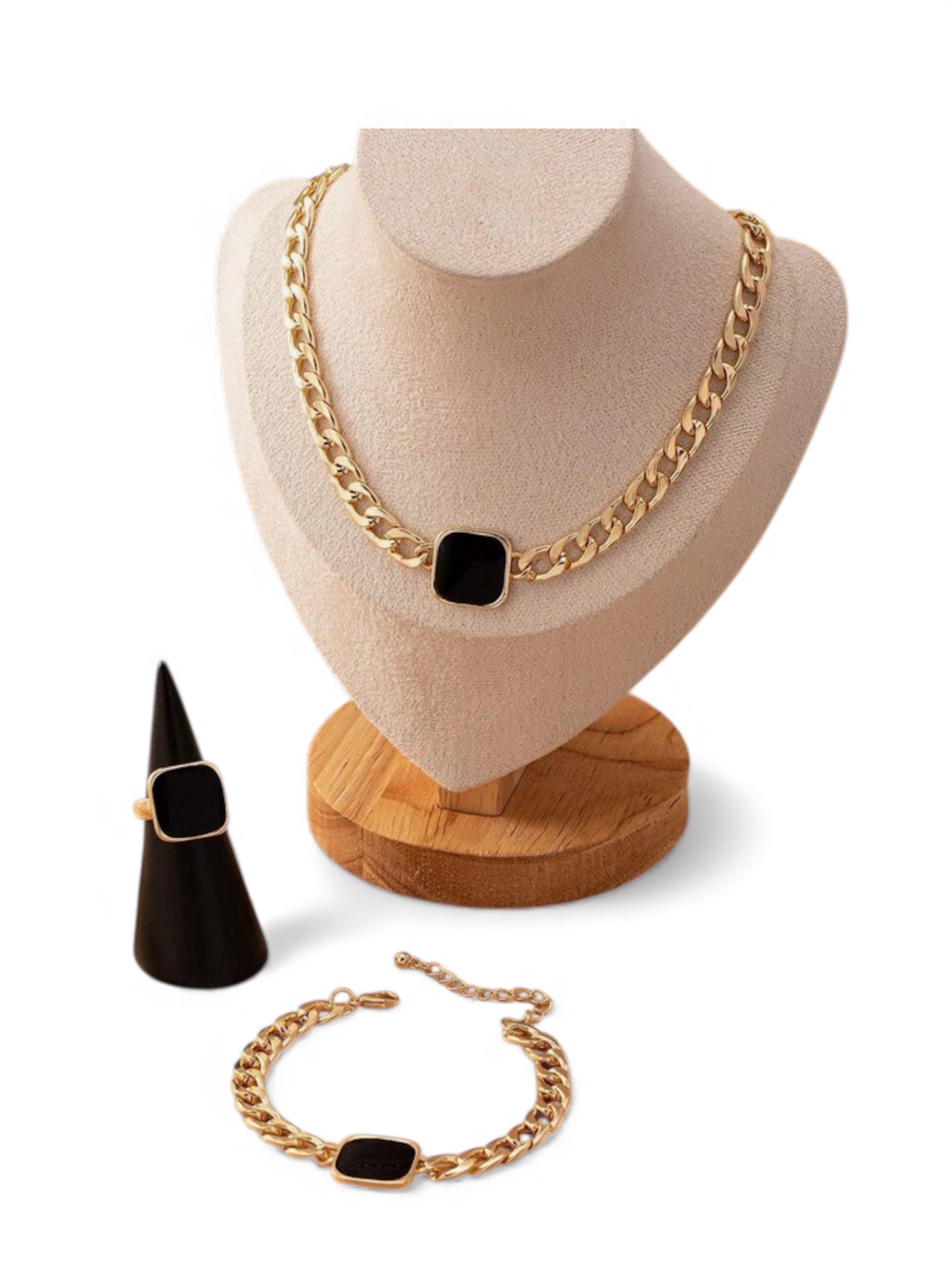 Parure Élégance Ébène – Collier, Bracelet & Bague (Or & Noir)