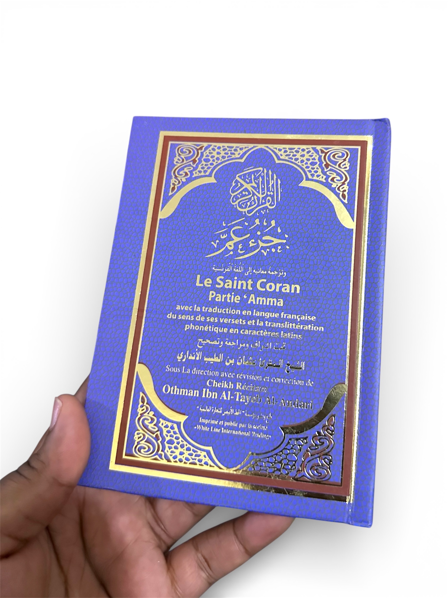 Un mini Coran Partie Amma avec traduction française et translittération, dans une élégante couverture bleue et dorée. Idéal pour apprendre, lire et méditer partout 🤲📖